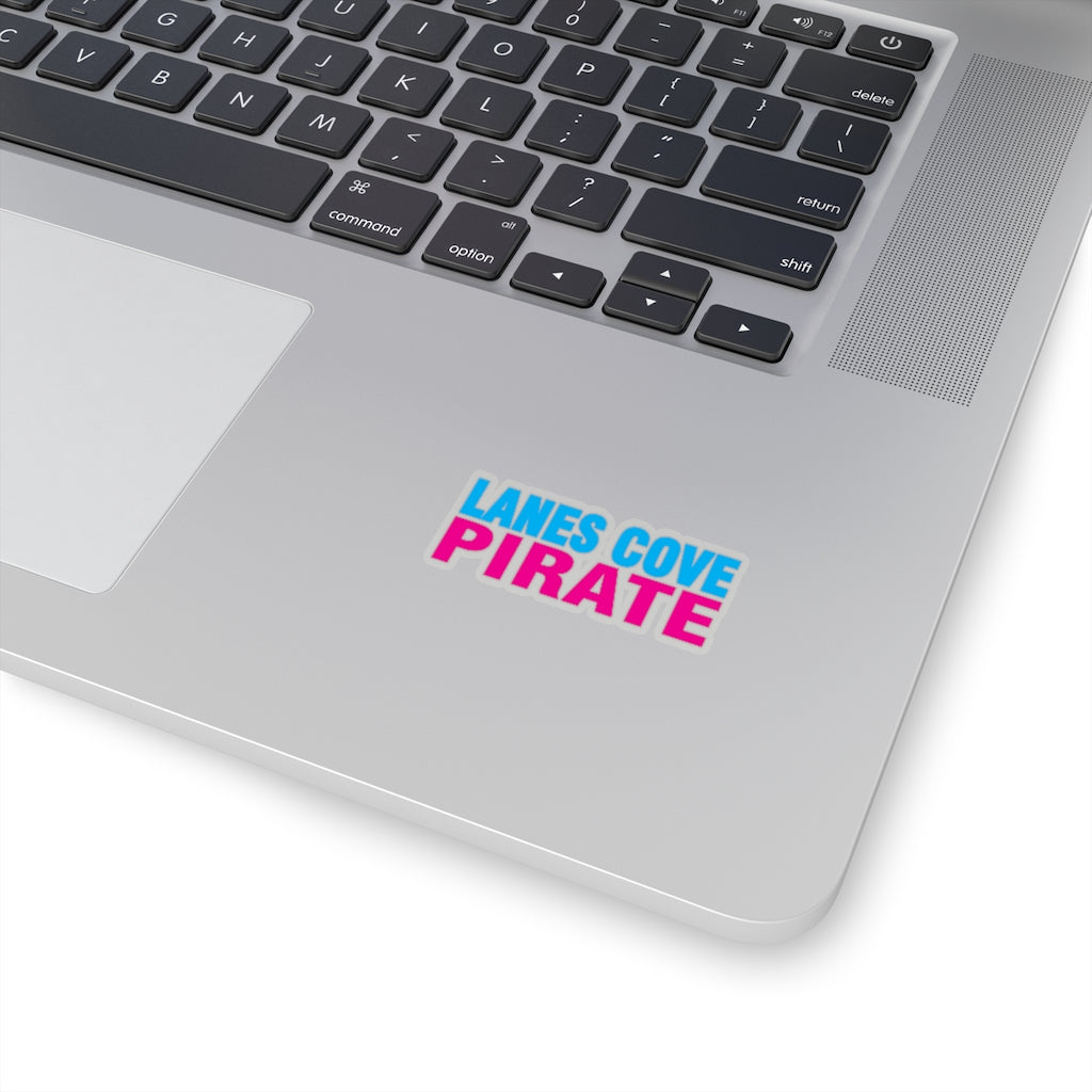 Shop Lanes Cove Pirate text sticker. Indoor/outdoor use, 4 sizes (2x2", 3x3", 4x4", 6x6"). Bold nautical typography design.